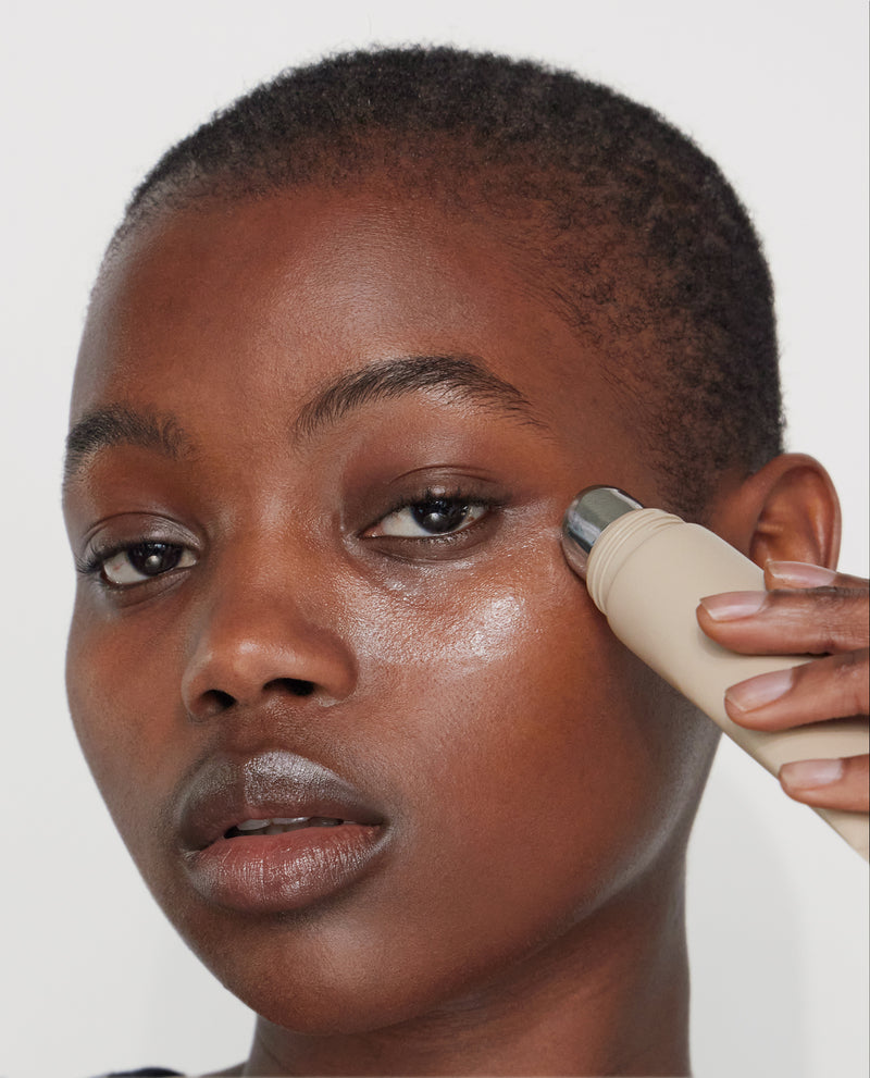 Use the rounded metal applicator in circular motions to apply and de-puff (focusing around the T-zone using upwards circular motions to buff in).
